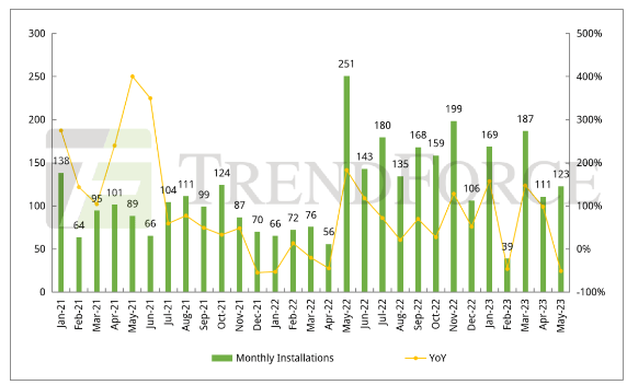 3. 2023年1-5月土耳其光伏新增裝機(jī)量達(dá)629 MW,同比增長20.8%,其中,5月土耳其光伏新增裝機(jī)123MW,同比下降51%,環(huán)比增長11%。2023年2月,土耳其設(shè)定太陽能電池進(jìn)口最低價格,利好土耳其本地制造商;2023年5月,土耳其政府針對太陽能光伏和其他類型的可再生能源推出10年FIT,刺激光伏裝機(jī)需求增長。